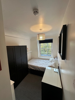 The room comes complete with all the bedding, full sized wardrobe, desk and chair, as well as stacks of shelving space.