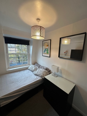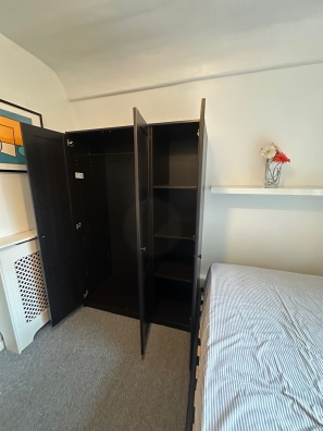 This is the only bedroom situated on the same level as the living areas. It is bright and airy and has two windows that have a great view towards the centre of London. The room has a full sized cupboard, chest of drawers, desk and chair and a large mirror.